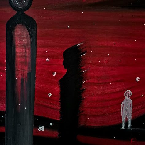 His works move through layered worlds - mapping inner transformation through symbol, colour and presence.